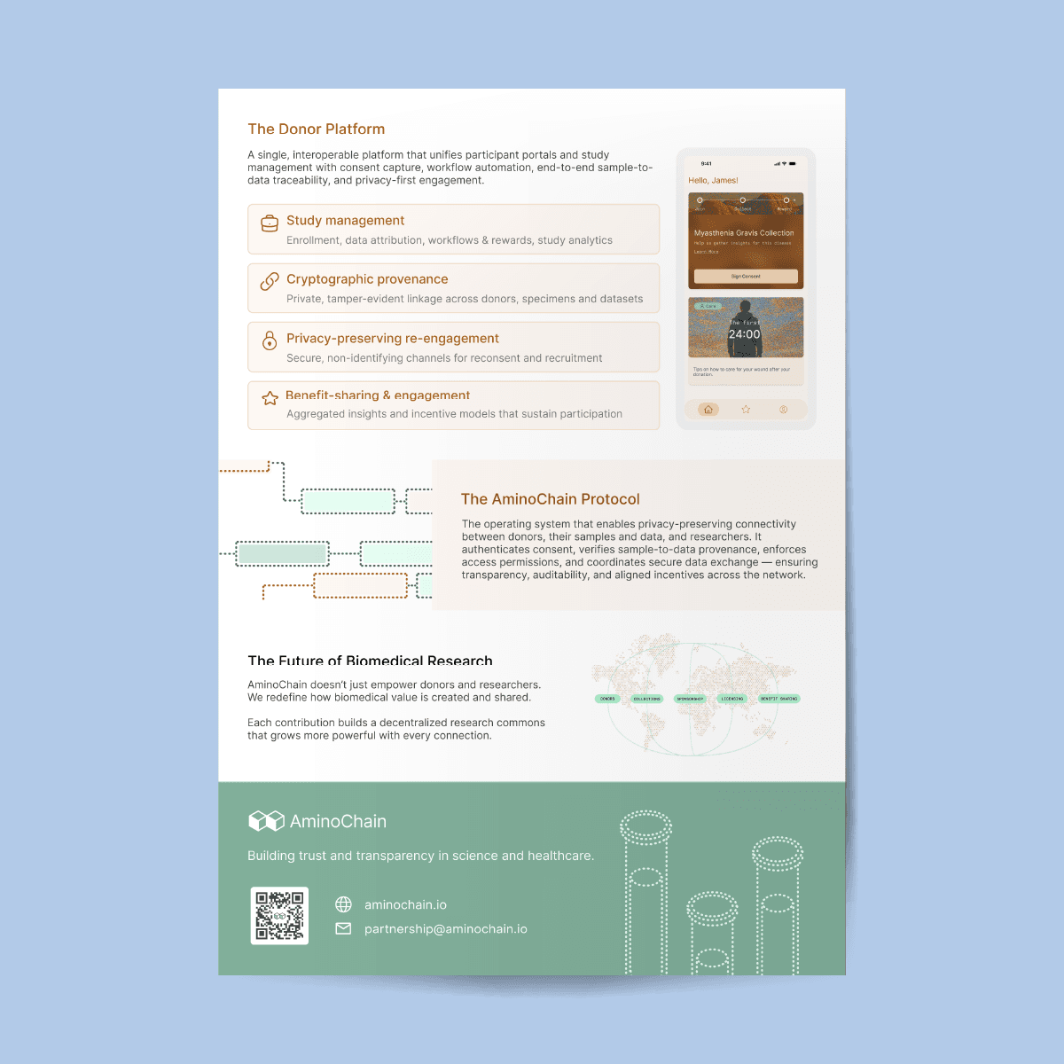 Throughout my AminoChain internship, I was tasked to make one pagers for conferences, graphics for social media and clinical studies, and PoC prototypes to land deals with major biobanks. I ensured that each design captured our company culture through our colors and values.